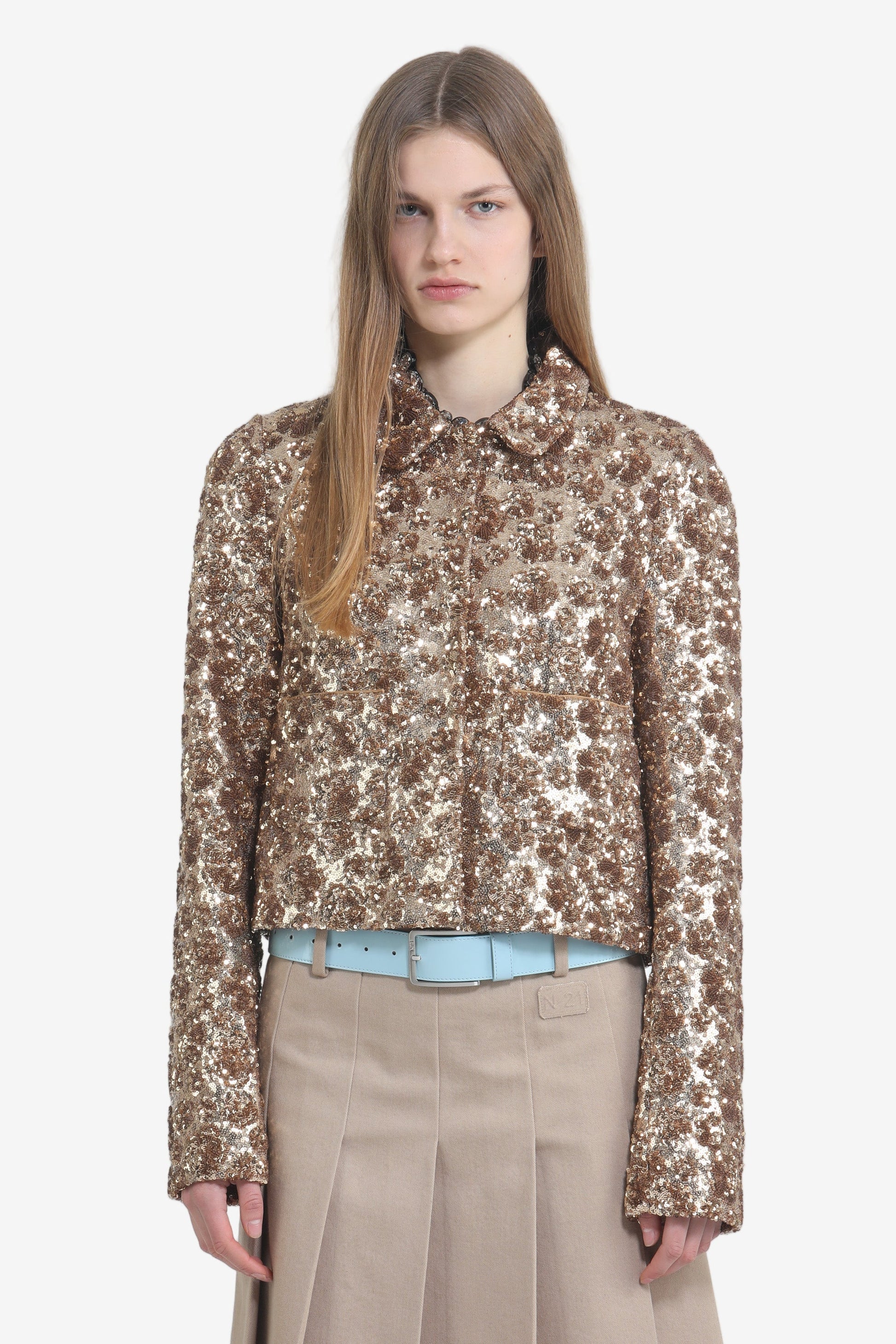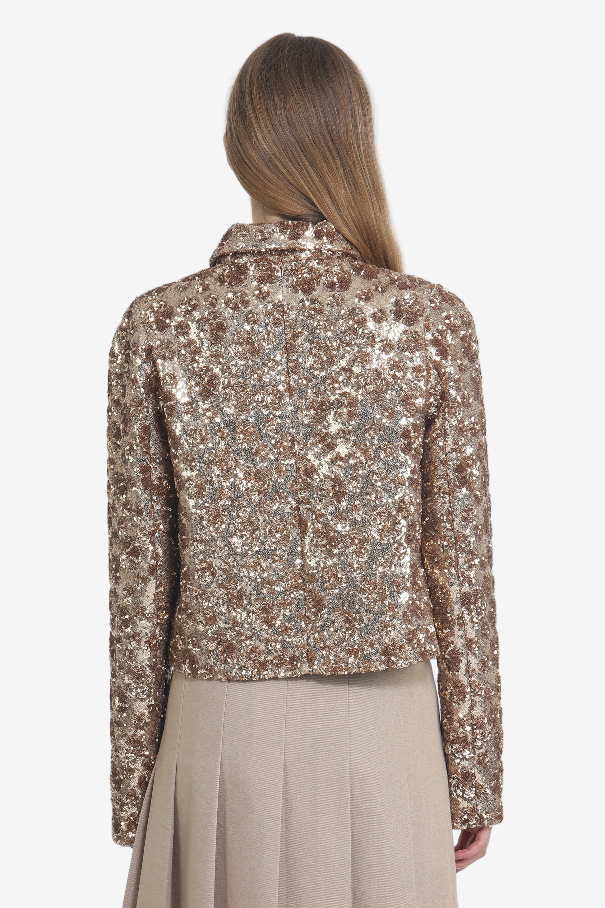 Giacca corta realizzata in tessuto con applicazioni di paillettes che coprono l'intera superficie. Il capo presenta una vestibilità regolare con collo classico e taschine frontali integrate nella costruzione. Il design è caratterizzato da una linea dritta e un taglio che arriva alla vita, ideale per un look definito e moderno.